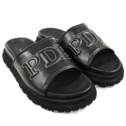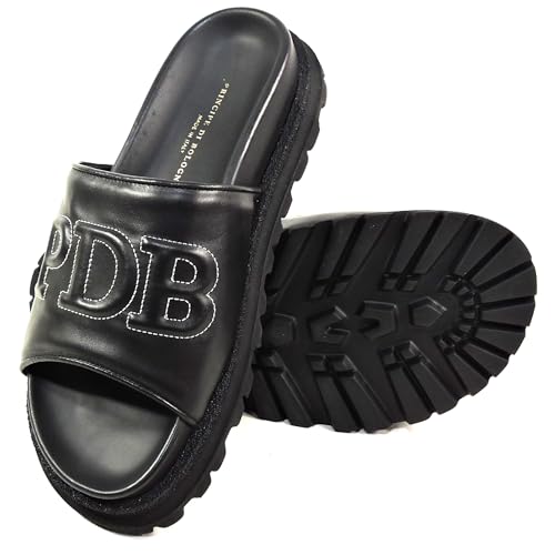 • ITALIAN DESIGN: Luxurious black leather slides with embossed 'PD' branding and contrast white stitching for a sophisticated look