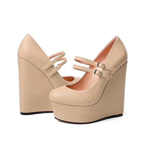 MERRORI Womens Buckle Platform Matte Cute Adjustable Strap Round Toe Solid Party Wedge High Heel Pumps Shoes 6 Inch 6