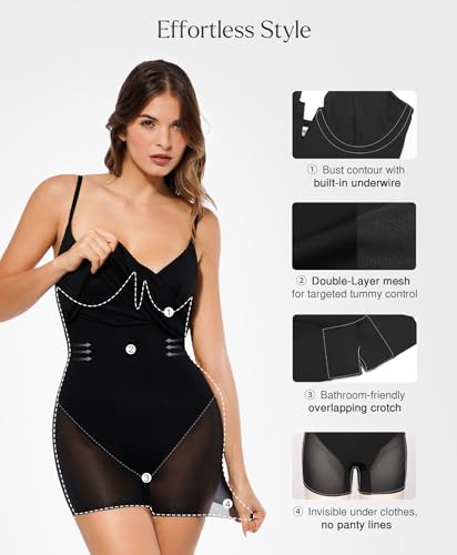 • Effortless All-in-One Elegance: This lace shapewear dress eliminates the need for extra layers, offering a seamless combination of outerwear, shapewear, built-in bra support, and panty-free comfort. The built in underwire and double-layer mesh tighten your core, lift your bust, smooth your abdomen, and enhance your buttocks, accentuating your curves effortlessly