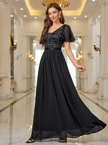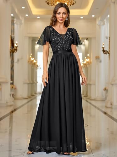 Miusol Women's Elegant Deep-V Neck Ruffle Tulle Sleeve Sequin Lace Formal Maxi Dress 1
