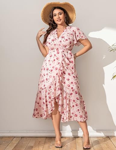 Women’s 2025 Floral Summer Dress Wrap V Neck Plus Size Boho Belted Ruffle Hem Flowy Maxi Dresses 4