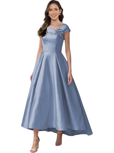 More information about Satin A Line Mother of The Bride Dresses with Pockets Asymmetric Neck Hi-Low Tea Length Flower Formal Evening Gown