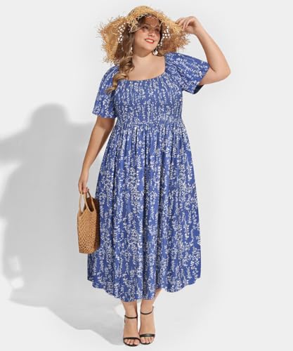 RITERA Plus Size Dresses for Curvy Women Square Neck Short Sleeve Summer Floral Smocked Maxi Dress with Pocket XL-5XL 6