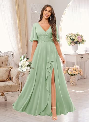 HOT ! Sukleet Women's V Neck Flutter Sleeve Bridesmaid Dress Long for Wedding Ruffled Chiffon Formal Dress with Slit