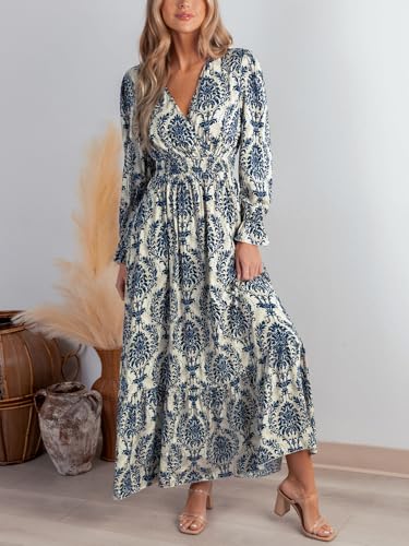 HOT ! CUPSHE Maxi Dresses for Women V Neck Ruffled Long Sleeve Paisley Smocked Waist A Line Casual Flowy Fall Wedding Guest Dress
