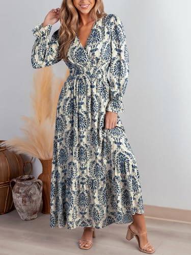 CUPSHE Maxi Dresses for Women V Neck Ruffled Long Sleeve Paisley Smocked Waist A Line Casual Flowy Fall Wedding Guest Dress 1