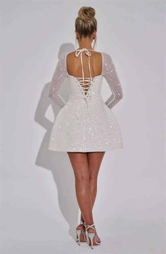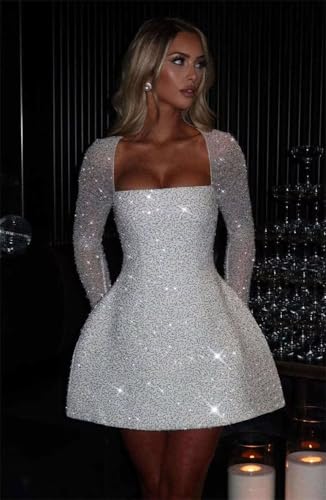 • Features:Long Sleeve, Sparkly Glitter Sequin Fabric, Square Neck, A Line, Short /Mini, Above Knee Length, Sexy Backless, Built-In Bra, Fully Lined