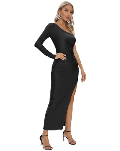 Aigeman Womens One Shoulder Long Sleeve Maxi Dress Bodycon Ruched Split Thigh Formal Dress 218 1