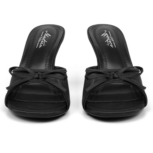 • Fashion-Forward Design: Black heeled sandals with open square toe and mesh upper create a modern, and the delicate bow detail adds a playful yet elegant touch.