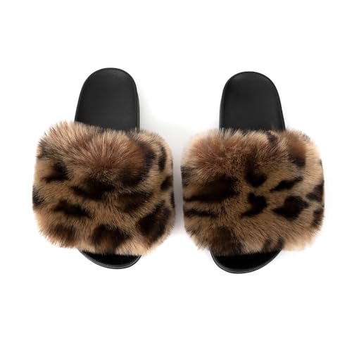 FUNKYMONKEY Women's Slides Faux Fur Cute Slip On Fuzzy Slippers Comfort Flat Sandals 6