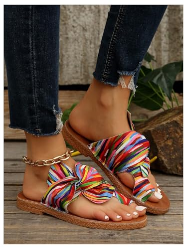 OYOANGLE Women's Colorful Bow Knot Toe Post Slide Sandals Comfortable Open Toe Sandals Summer Beach Shoes 5