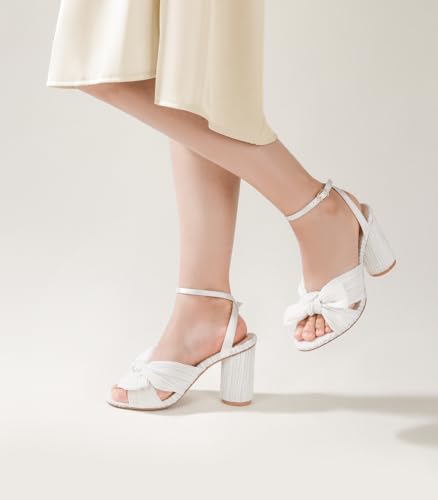 Ankis White Gold Bow Heel Chunky Wedding Shoes for Bride 3.15 Inch High Heel Open Toe Ankle Buckle Strap Dressy Pleated Kont Women Shoe Party Graduation Event Summer 5