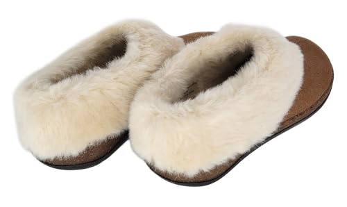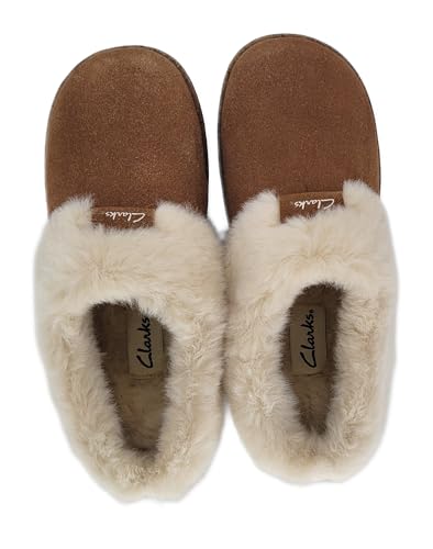 More information about Clarks Womens Slipper Suede Leather Plain Toe - Plush Faux Fur Collar/Lined With A Cork Midsole - Open Back Indoor Outdoor House Slippers For Women (Cognac US 9
