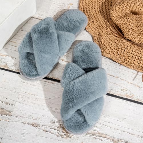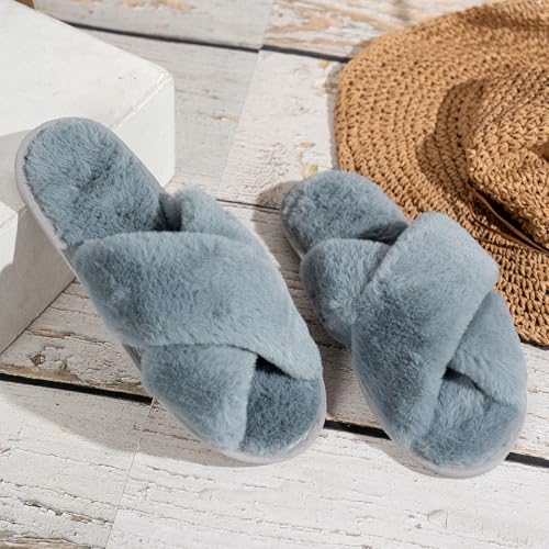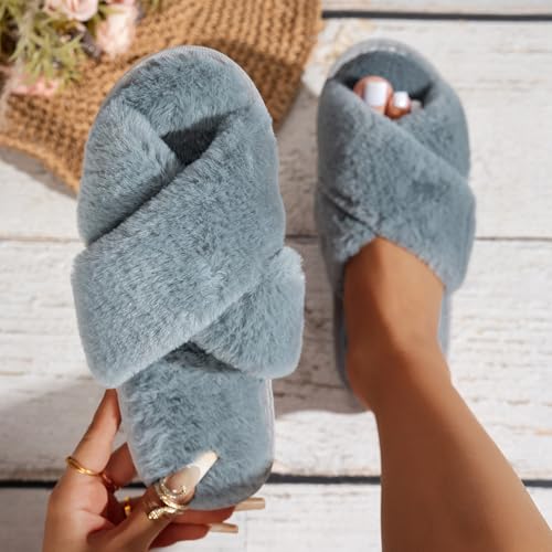 Women's Fuzzy Open Toe Slippers Comfy Cross Band Memory Foam Bedroom House Shoes Indoor Outdoor Slides Slippers 7