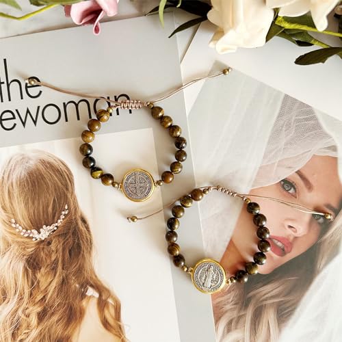 2Pcs San Benito Bracelet Tigher Eye Bracelet Saint Benedict Medal Catholic San Benito Medalla 4