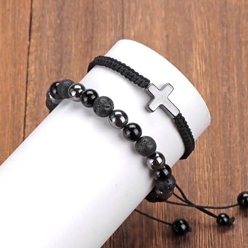 2 pcs Cross Beaded Bracelets for Men,8mm Black Obsidian Tiger eyes Hematite Mens Triple Protection Bracelet Set Fathers Day Birthday Jewelry Gifts 5