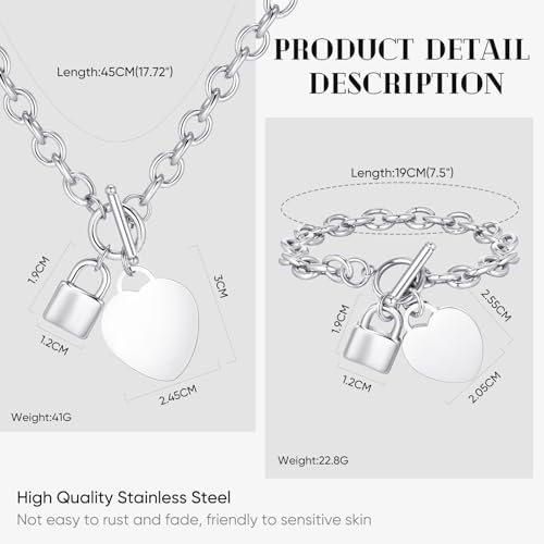 VNOX Personalized Initial Name Stainless Steel Trendy Cable Chain Bracelet Neckalce Set with Padlock Heart Charm and Toggle Clasp Closure 5