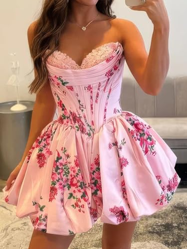 • Features: Short, Satin, Strapless, Corset, Floral Print, Lace Sweetheart, Ruched, A Line, Lace Up Back