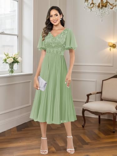 Mother of The Bride Dresses for Wedding V Neck Pleated A Line Tea Length Lace Chiffon Womens Formal Dress 6