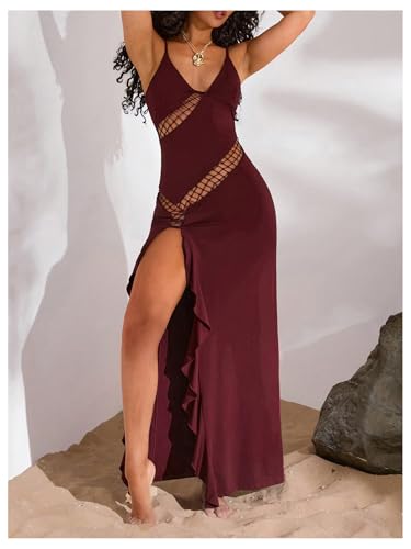 • Feature: Hollow Out, Spaghetti Strap, V Neck, Sleeveless, Slit Thigh, Ruffle Trim, Asymmetrical, Bodycon Long Cami Dresses for Women