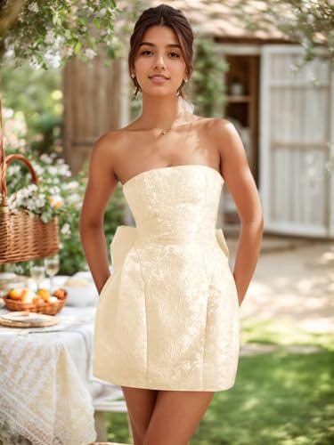 BONOYUER Satin Strapless Homecoming Dresses for Teens Embroidery Short Cocktail Mini Party Dresses with Bow 4