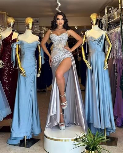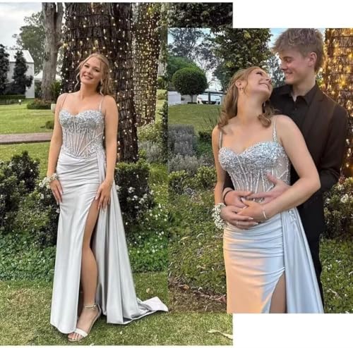 Mermaid Prom Dresses for Women Sparkly Satin Lace Appliques Formal Dress with Slit Spaghetti Straps He5094 5