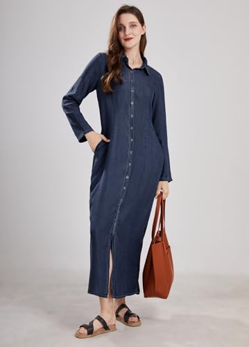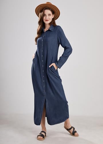 utcoco Womens Casual Button Down Denim Maxi Dress Lapel Long Sleeve Long Jean Dresses with Pockets 1