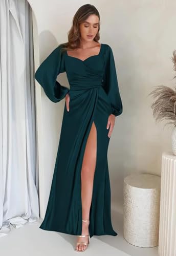 HOT ! Long Sleeve Satin Bridesmaid Dresses for Women with Slit Ruched Long Corset Prom Formal Evening Ball Gown