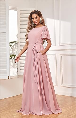 Chiffon Bridesmaid Dresses for Women with Pockets Sash Long Flutter Sleeves Wedding Formal Evening Gown 5