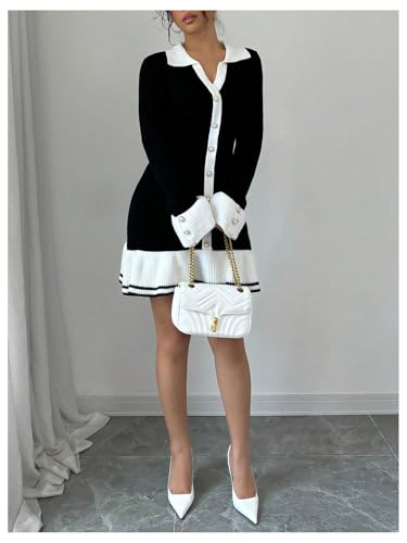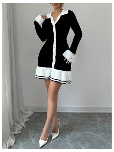SOLY HUX Women's Sweater Dress Color Block Collar V Neck Long Sleeve Ruffle Hem Bodycon Knit Mini Dresses 1