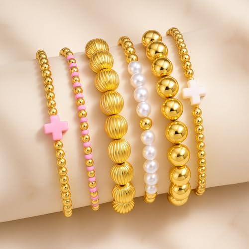 • Custom Gold Bracelet Stack: This gold bracelet set includes a collection of gold beaded bracelets that stack perfectly with any other bracelets in your collection. Stretch beaded bracelets add a playful twist to any outfit, The cross charm adds a meaningful accent, making it perfect for daily wear or special occasions. allowing you to mix and match or simply wear one for a classic look.