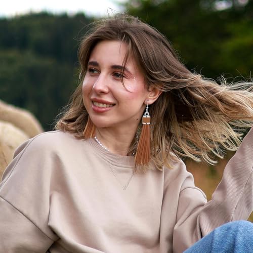 • Package&Size: You`ll get 2 pairs Long Pu Leather Tassels Western Earrings. Dangle part size :11cm(4.33in), Fish hook part size:1.8cm(0.71inch). More details you could check the size picture shows.Elevate your cowgirl style with these stunning RechicGu Western earrings for women. Featuring stainless steel hook and leather tassels, these earrings are perfect for adding a touch of western flair to outfit and the perfect addition to cowgirl's jewelry collection.