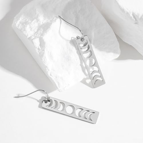 Moon Phase Earrings for Women, Silver Boho Earrings, Lunar Cycle Witchy Earrings, Scandinavian Flower Long Bar Earrings 5