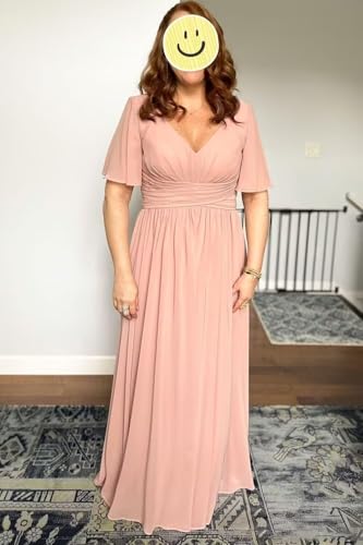 • Features: Unique double V-Neck with ruched bust design make this bridesmaid dress flattering and gorgeous, Flowy chiffon bridesmaid dresses with pockets for women, elegant v neck pleated evening gown with empire waist, paired with short flutter sleeves and classic open back. The look is complete with an A-line skirt and leg slit.