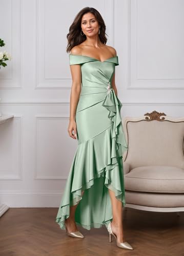 High Low Mother of The Bride Dresses for Wedding Off The Shoulder Formal Dress Satin Ruffles Evening Party Gown 6