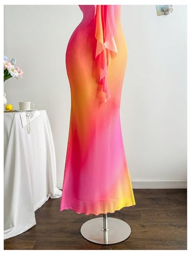 • Elegant long dress for women features a vibrant gradient pattern and a halter neck design with a decorative flower, adding a playful and chic element to the dress that is both eye-catching and stylish