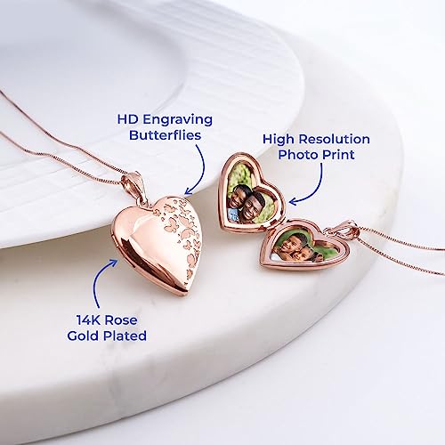 • Personalized Heart Locket - The Front of the Heart Shaped Locket Is Engraved with ‘Butterflies’ You Can Engrave a Message on the Back. Choose a Favorite Photo and Create the Perfect Gift. Click “Customize Now” to Design Your Custom Locket Necklace. Rose Gold, Locket + 1 Photo.
