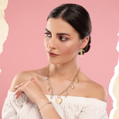 • Versatile and Fashionable: this necklace is practically multiple pieces in one, thanks to its fun, whimsical charms that you can customize or style however you want; Plated in chunky gold, it features a chunky, sturdy 16 inches /40.64 cm chain with 2 inches/ 5.08 cm extender, along with removable charms including a bow tie, love tag, hearts, envelope, palm tree, and pearl; The design is beautiful and elegant, and the bow earrings can stand out at the dance party
