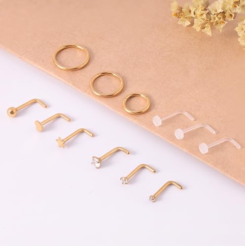 12PCS Hypoallergenic 14K Gold Plated 18G Nose Rings Studs Set for Women Men:3Pcs nose rings & 6Pcs L Shaped Nose Studs & 3Pcs Clear Nose Studs Gold/Silver 316L Surgical Stainless Steel Nose Piercing Jewelry 5