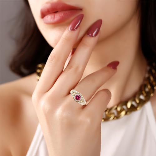 • Vintage Design: Ruby is the birthstone for July. It is also a traditional gift for those celebrating 15th or 40th anniversaries. This women's ruby ring features a 7mm round cut simulated/lab-grown ruby in the center and adorned with small moissanite; the ruby ring showcases vintage filigree design, making it an exquisite piece of jewelry