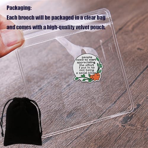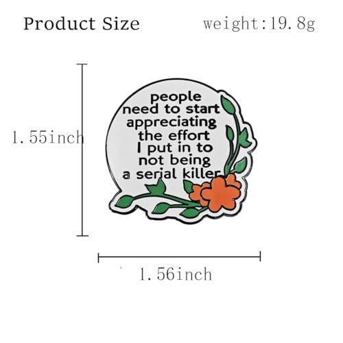 • DESIGN FEATURES: Stylish enamel pin featuring bold, eye-catching text with the humorous message, "People need to start appreciating the effort I put in to not being a serial killer." surrounded by decorative floral elements and green leaves on a white background.