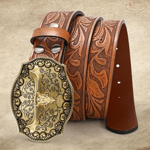 HOT ! JASGOOD Western Leather Cowboy Belt for Men Women Longhorn Buckle Cowgirl Belt Floral Engraved Embossed Unisex Belt for Jeans