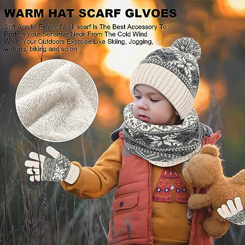 Kids Winter Knit Beanie Hat Scarf Gloves Set for Toddler Girls Boys with Pompom,Child Fleece Lining Hat Scarf Gloves 1