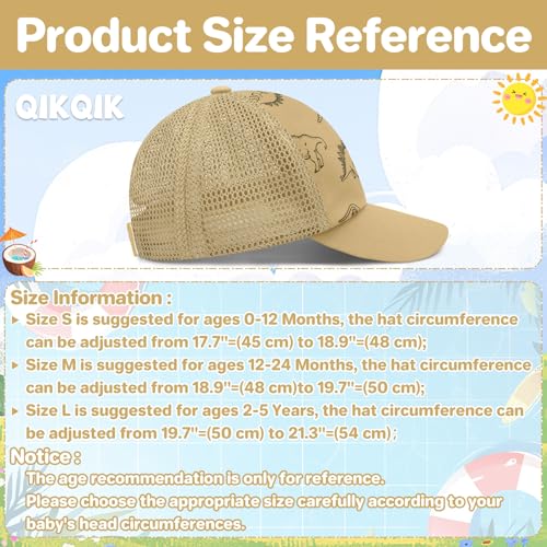 • ADJUSTABLE DESIGN & SWEAT-ABSORPTION: The toddler baseball hat features an adjustable velcro to ensure a snug fit and leave ample room for your child's growth. And the infant baseball cap is lined with a pure cotton sweatband that efficiently wicks away moisture and keeps children's heads cool and dry during playtime. Whether they're running around on scorching summer days or engaging in outdoor adventures, the sweatband of the newborn baseball cap prevents sweat from trickling into their eyes.