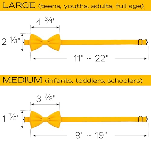 • Sizing: The bow of the Large size bow tie is 4 ¾" x 2 ⅓". The strap length is adjustable from 11" to 22". The Large size fits teens, youths, and adults. The bow of the Medium size bow tie is 3 ⅞" x 1 ⅞". The strap length is adjustable from 9" to 19". The Medium size fits infants, toddlers, and school-age children.