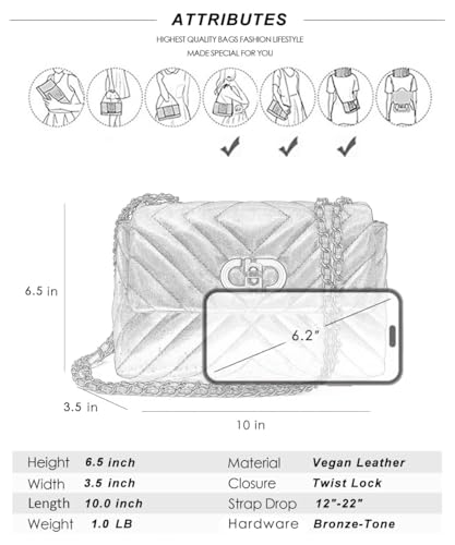 • Classic Design - The Glitzall over the shoulder bag is made of soft faux leather for a luxurious feel and lasting quality. As a classic designer purse, it features exquisite Quilted exterior, Turn-lock closure, Bronze-Tone hardware and Chain Strap design, which add infinite elegance and luxury to this bag