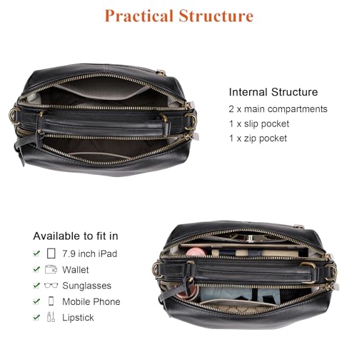 • Large Capacity: This real leather crossbody purse offers enough space to store your daily items, including sunglasses, mobile phone, cosmetics, 7.9 inch iPad, and so on.