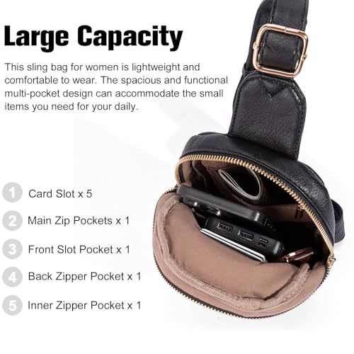 • 【Multi-functional】 :This sling bag for women is multi-functional and designed to provide convenient storage options. It comes with one main compartments, including 5 card slots in the front zip pockets, as well as a big pocket on both the front and back. This leather sling bag allows you to store your essentials, such as keys, phone, wallet, passport, and other small valuables, while keeping them easily accessible.