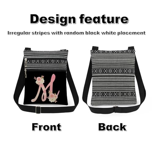 • ​​3. 【Design】​​The Floral Letter "M" crossbody bag uses heat transfer printing technology for fade-resistant patterns. The irregular black-and-white stripes are crafted with a woven process, and their placement varies randomly (positions may differ slightly due to hand-cutting). The dual-pocket design helps efficiently organize different items, while the adjustable strap accommodates most users.