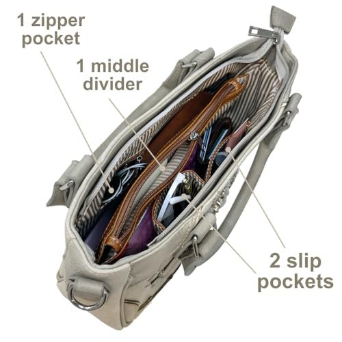 • Cross Purse Designed for Convenience - This faith purse features a center zipper divider, a zippered side pocket, and two interior pockets. It also includes a back phone pocket and zippered conceal carry compartment (measures 6" length x 8.5" deep). This handbag measures 12" length x 9.5" height x 4.5" width and has a zippered top closure.